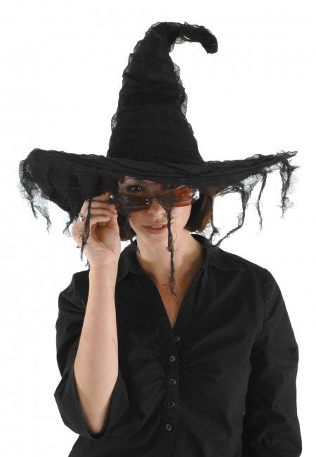 "Double double toil and trouble, Fire burn and cauldron bubble"! Look elegant and punky while stirring your cauldron! This beautiful, black witches hat is covered in tattered black gauze for creepy, yet classic look. This wide brimmed hat has an internal velcro adjustor for an excellent fit.