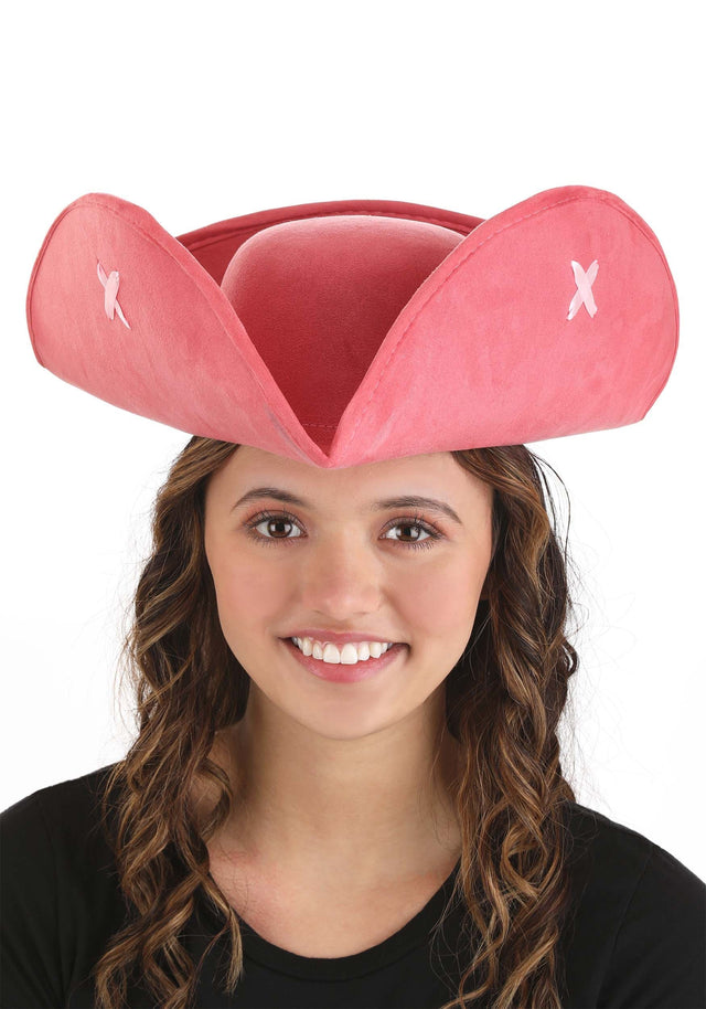 Add an adorable twist to your traditional pirate look with this sweet pink tricorn hat. Made from a faux suede pink fabric. This tricorn hat has a wired brim that allows you to shape it to taste. Hat has an elastic band on the inside for a great fit. Each side is sewn with a pink ribbon "X" as an extra touch of style. Perfect choice for a pirate captain or general/admiral look. One size fits most.
