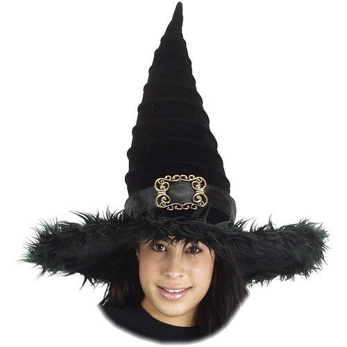 Witch hats don't have to be plain and boring. Upgrade your hat game with this lovely, stylized witch hat. Hat is crafted from a rich black velvet and features ridges all the way from the brim to the tip. Brim is black velvet with a fur trim and wire so you can shape it how you like. Witch hat has a satin hatband with a black plastic scroll belt buckle. Hat has an internal size adjustor and a secret pocket for cash or ID on the inside. A fun twist on a traditional witch hat. One size fits most teens and adults.