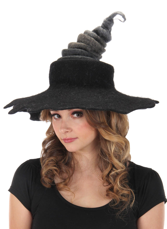 Ditch your traditional witches hat and move into the modern pagan era with this stunning hat. This gorgeous hat is made from felted wool. Each hat is individually handcrafted by an artist for Elope, no two are alike. Hats are around 25 inches tall with a 6 inch brim. Due to its stacked nature, you can pull all the layers out or just a few to switch up how you wear it. Circumference is around 22 1/2 inches. Made form wool felt in shades of black and grey. We think you will love this beautiful witch hat as much as we do.