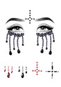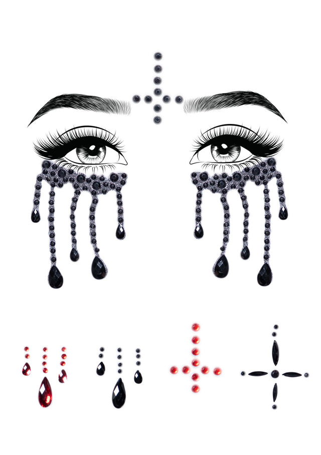Not all nuns are pious and holy, some are dark and twisted.  If your nun is the latter type you can be sexy, sassy and possessed.  These Leg Avenue face jewels are made from black and red rhinestones.  Set includes two black crosses, one red cross, black tear sets, and a red and black tear set.  Use all at once or use pieces individually.  Use to design your own naughty nun.  Jewels stick well on multiple surfaces.  Skin friendly material.  Your face and body should be clean and dry before you apply.