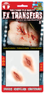 Want to look scary and gory for Halloween? Are you the victim in a Murder Mystery? No clue how to use all that special fx makeup at the local store? This appliance will make you like you have been stabbed. Set includes two knife wounds. No need to hire a professional or spend tons of money on lots of different waxes, bloods and latex. Tinsley Transfers apply with water! No messy glues, adhesives or latex needed! All you need is scissors, water and a towel or sponge. Applies just like a fake tattoo. Add stage blood for a hyper realistic look. 3D FX transfers can make anyone a makeup artist! Washes off with soap and water or a makeup remover. Wonderful for people with latex allergies, no latex is used in making this item. Transfers come in a large selection of wounds, facial features and more.