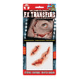 Want to look scary and gory for Halloween?  Are you the victim in a Murder Mystery?  No clue how to use all that special fx makeup at the local store?  No need to hire a professional or spend tons of money on lots of different waxes, bloods and latex.  Tinsley Transfers apply with water!  No messy glues, adhesives or latex needed!  All you need is scissors, water and a towel or sponge.  Applies just like a fake tattoo.  Add stage blood for a hyper realistic look.  3D FX transfers can make anyone a makeup artist!  Washes off with soap and water or a makeup remover.  Wonderful for people with latex allergies, no latex is used in making this item.  Transfers come in a large selection of wounds, facial features and more.