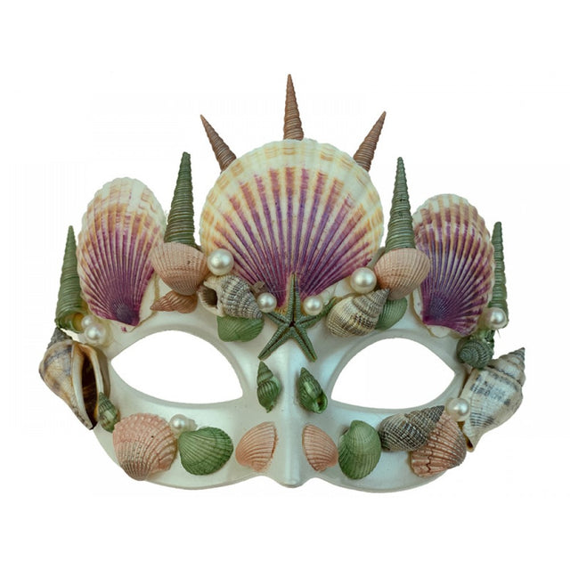 Under the sea the mermaid collects objects and stores them in her treasure cave. This mask is for those who love everything mermaid! This plastic resin mask is decorated with real seashell and faux pearls. Shells have been painted a pearlescent paint in shades of pink, peach and green. Mask has two satin ribbons that hold the mask in place. Pair it with a mermaid tail and wig to complete your look, sold separately. One size fits most adults and teens. Great for mermaid display.