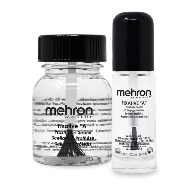 Fixative “A”™ is a clear liquid plastic sealer for Modeling Wax, Putty/Wax and SynWax. Available in a variety of sizes. Apply with brush as a protective sealer over Modeling Wax, Putty/Wax and SynWax constructions before applying makeup. Allow to 2-3 minutes to dry. Remove with Spirit Gum Remover followed by soap and water. Fixative “A”™ can be used to seal intricate water based paint designs, making them waterproof so they appear like tattoos.