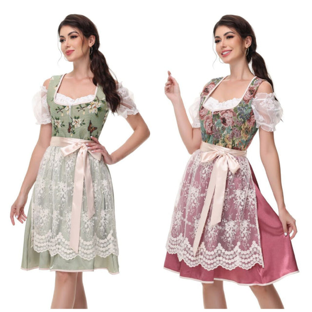 Gorgeous replica renaissance dress come with corset with attached skirt, cap sleeve dirndl style shirt in ivory and lace apron.
