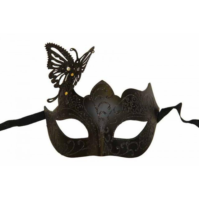 Looking for a mask that's both mysterious and charming? Our Black Venetian Mask with Metal Butterfly accent adds the perfect touch of intrigue to any costume or outfit. Don't just take our word for it, let this unique mask speak for itself (but in a very intriguing, butterfly-accented way).