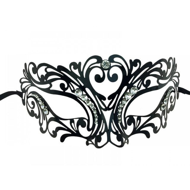 If you have beauty and grace, you need a lovely mask for your face. You will be wowed by this beauty. This mask is made from a thin, black laser cut metal. Mask looks like vines and a heart in the center. Mask features rhinestone diamonds by the upper and lower edges of the eyes. Mask also has a large rhinestone in the center of the mask. Two black satin ribbons help secure the mask in place. Perfect for a masquerade ball, prom, carnival, Mardi Gras or Halloween party.