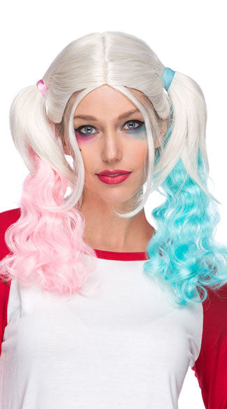 You are going to love this Carley (cough, cough) wig to complete your super villain costume. This blonde wig is pulled into two ponytails one with pink ends and one with blue ends. The ponytails are wavy. This white blonde wig has two long strands that frame the face and a short fringe of hair at the nape of the neck. Perfect for your Harley Quinn cosplay or for a goth or raver girl costume. One size fits most. Has an elastic adjuster for a great fit.