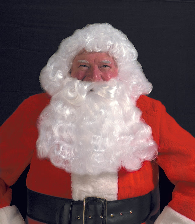 Santa has never looked so good! This really nice wig and beard set is a lovely snow white. Beard is mid chest length with gentle curls on the ends. Attached moustache is nicely curled. Beard has elastic straps that wrap around the top of the head. Wig is shoulder length with fun curls all around. Perfect for Santa or an old man costume. One size fits most men. Wig is not heat safe, made with synthetic fiber,