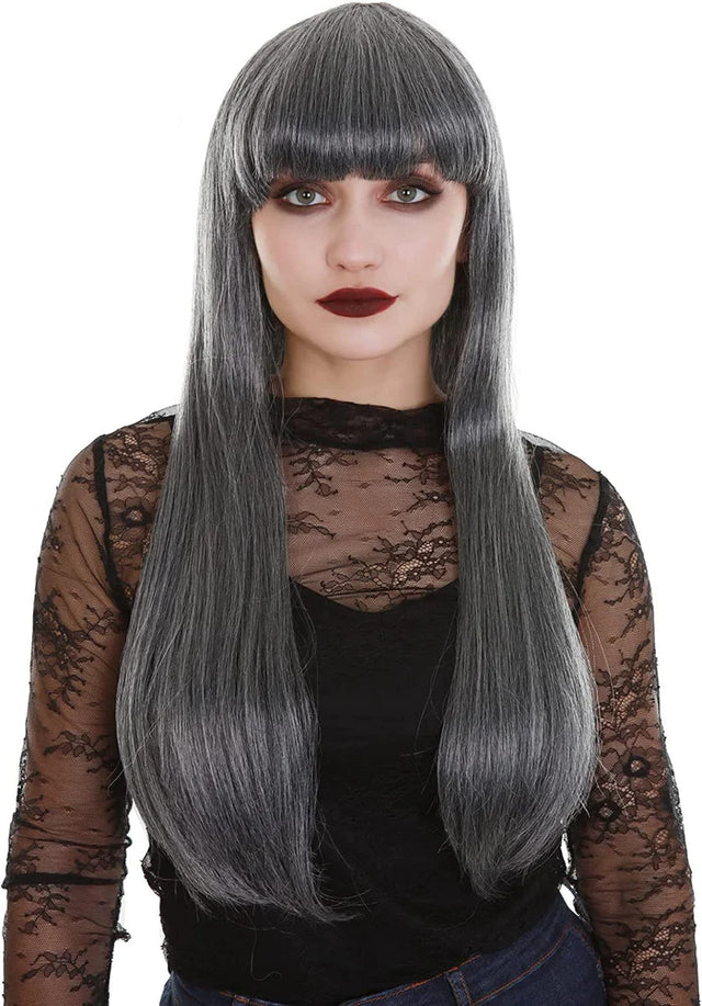 Be the sexiest sorceress or witch on the broom with this glorious long grey wig.  This beauty has blunt bangs and long straight sides and back.   Wig falls to mid-back.  This one size fits most wig has elastic in the cap for a snug fit.  A terrific choice for a ghostly character, witches, elder people and goddesses.  Wig is not heat friendly.