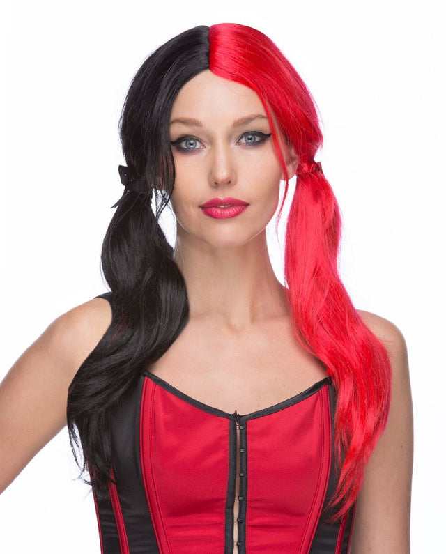 Channel your inner Gothic City babe with this sexy, long half black and half red wig. This pigtail wig is perfect for your own twist on Harley Quinn. Wig has an inside elastic adjustor. Pigtails have satin ties in red and black. This is a great wig for goths, modern vamps, witches and more. One size fits most.