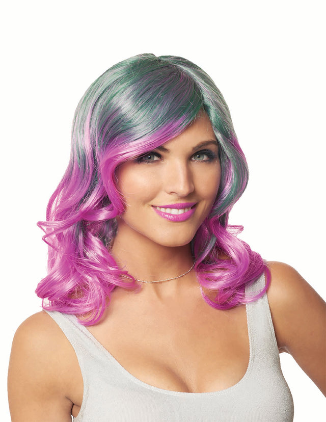 Need a bright, beautiful wig for your next costume or party? This beauty has a teal and lavender blended top that has lavender ends. Wig is shoulder length and has a side part with gentle curls. Perfect for a rocker, punk, goth or party girl. Also good for a futuristic look. Wig is not heat friendly but is a one size fits most. Great for cosplay, Mardi Gras, Halloween or fancy dress party.