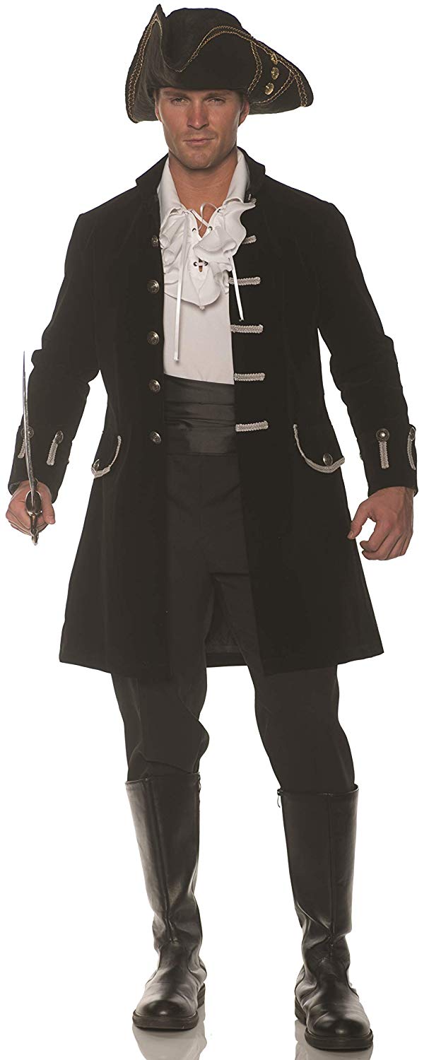 You don't need multiple jackets for multiple characters! You just need this gorgeous frock coat from Underwraps. Frock coat is made from a soft "velvet" fabric. Coat has a stand up collar and large cuffs on the sleeves. Coat is trimmed in braid on the front and sleeve cuffs. The jacket falls to mid thigh and has faux pockets on the front. Jacket is lined with a black satin. Frock coat has decorative buttons down the front and around the sleeve cuffs. Perfect for a pirate or ship captain, renaissance gentleman or noble lord. One size fits up to a 42-46 inch chest and 2XL fits up to a 48-50 inch chest. Choose from Black, Brown, Navy or Burgundy.