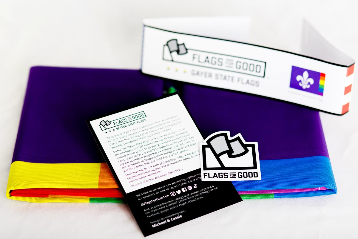 ✍️ The Design: For our "Better State Flags" series, our Louisiana Flag design was a pretty straight forward. We scrapped the entire Louisiana flag, pelican and all, and started from scratch. Then we added a rainbow on the fly to make a more fabulous version. The Rainbow fly edge will flap in the breeze while the Fleur De Lis will be visible in most wind conditions. We hope you like it better than the bleeding pelican!
