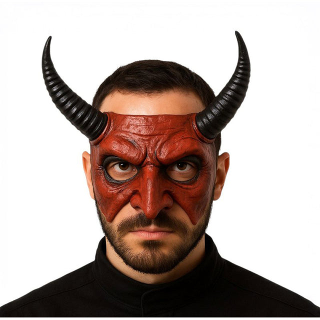 Embrace your boldest side with the Red Horned Devil Mask, showcasing fierce black curved horns. Perfect for Halloween, horror-inspired looks, or stage performances, this mask delivers a striking and fiery presence. Essential for those who dare to stand out in devilish style and unforgettable fright nights.