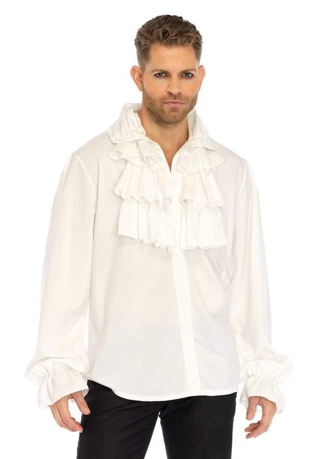 Whether you want to be a pirate or a prince, this is the perfect base for your costume. This ultra soft, button front shirt has multiple layers of ruffles on the front and at the wrist. Shirt has full sleeves. Looks great with a great coat or fancy vest. Available in white or black. Shirt run true to size.