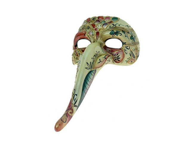 A beautiful traditional styled Venetian Carnivale Long Nosed Mask called a Scaramuccia. This mask is handpainted with beautiful floral details and has black silk ribbon ties. Great for masquerades, fancy dress parties, Mardi Gras and more, Made with a lightweight plastic, this makes a great costume accessory and/or decoration for your home.